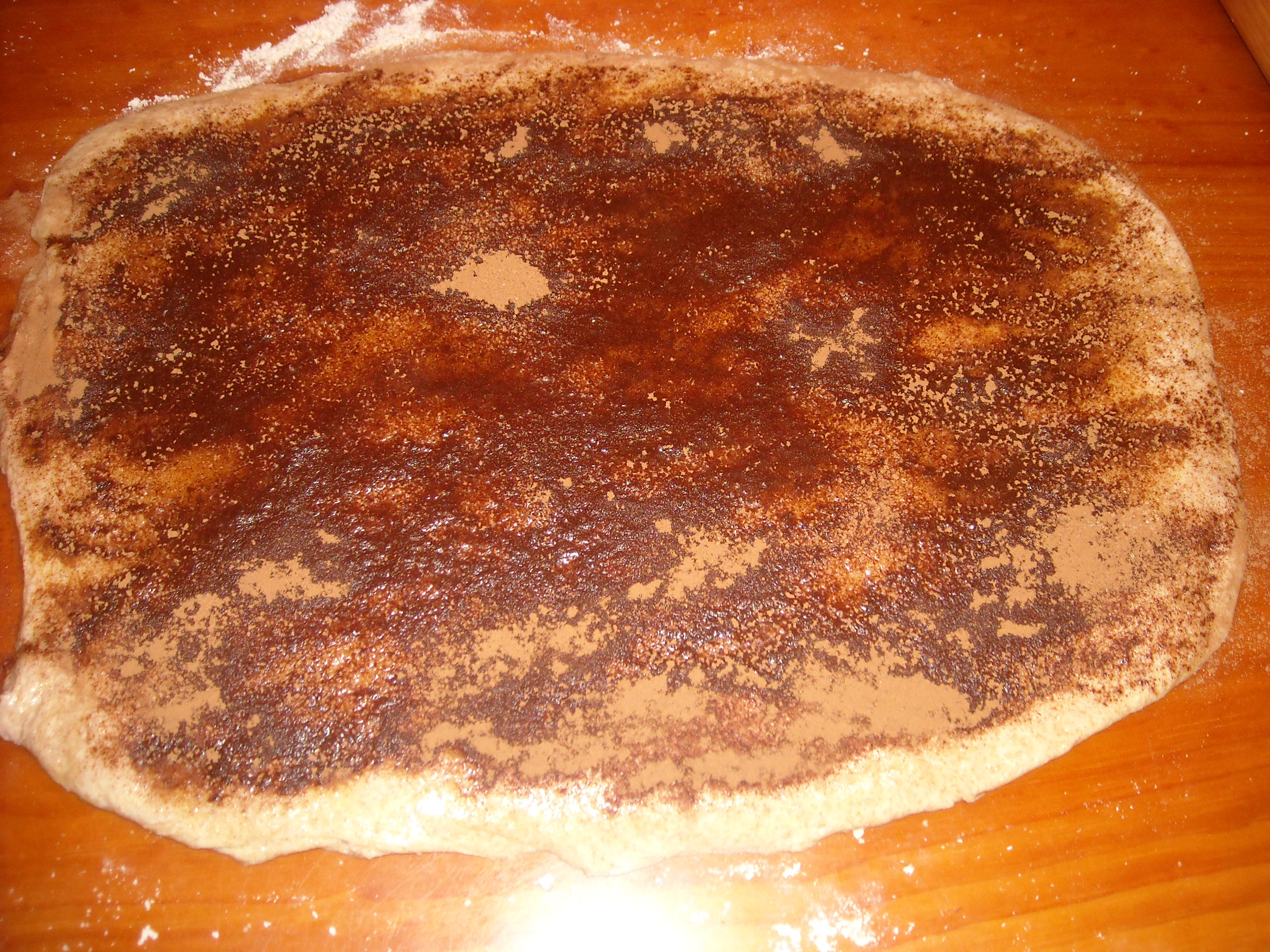 Brush butter on top of the dough, then sprinkle sugar over the butter, finish with cinnamon πŸ˜‰