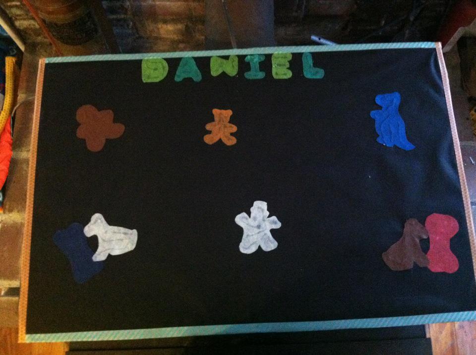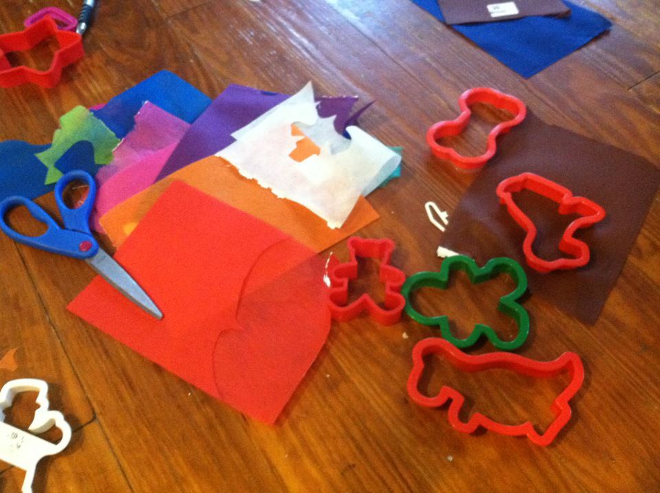 We used cookie cutters to trace letters and animals for our wall art. A pencil worked on the light colors, but we found that a pen (or marker) was needed on the darker colors for tracing.